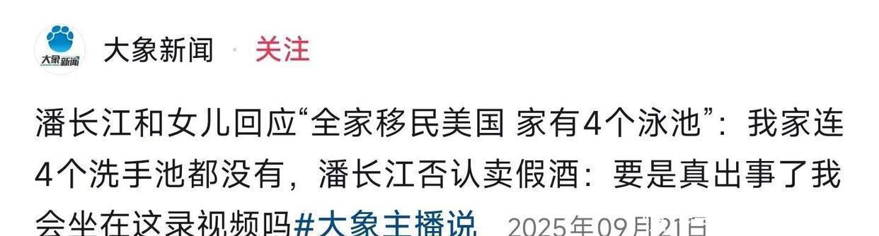 大象新闻报道,潘长江和女儿回应“全家移民美国,家里有4个泳池”一事,发布时间是2025年9月21日。